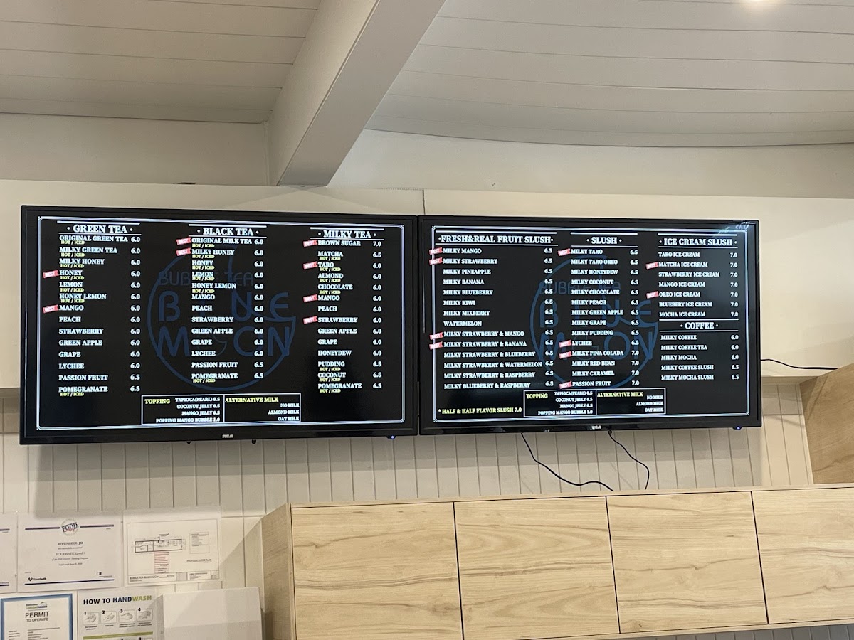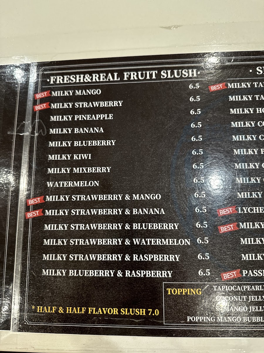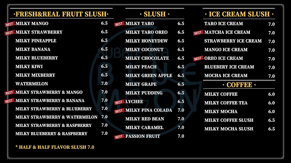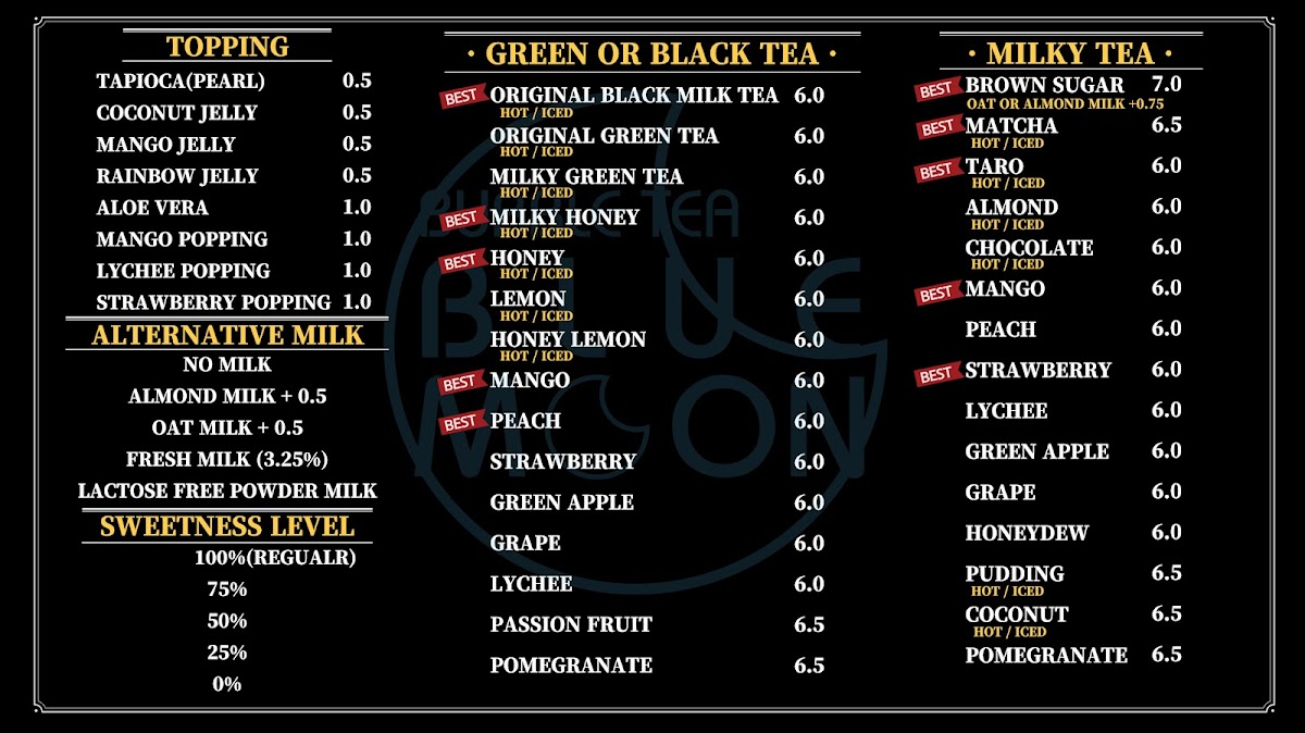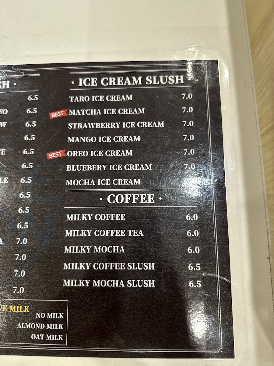 In conclusion, the menu at Bubble Tea Bluemoon offers a diverse and satisfying selection that caters to a wide range of tastes, from refreshing drinks to light bites and desserts. Standout coffee options like Milky Coffee and Milky Mocha Slush provide rich, creamy flavors, while indulgent treats such as Oreo Ice Cream and Matcha Green Tea Ice Cream Slush add a sweet, cooling twist. The fruit slush lineup, including Watermelon and Milky Strawberry + Mango, delivers fresh and vibrant choices, complemented by savory items like the Chicken Sandwich and Bulgogi Croissant Sandwich. Their milk teas, especially Brown Sugar Milk Tea and Mango Milky Tea, are classic crowd-pleasers, while unique slush flavors like Milky Piña Colada and Lychee keep things interesting. Traditional teas such as Lemon Black Tea and Grapefruit Green Tea balance the menu nicely, and desserts like Raspberry Yogurt Cheesecake and the Macaron 6 Pack provide a delightful finish. Overall, the menu reflects a well-rounded mix of comfort, creativity, and refreshing variety.