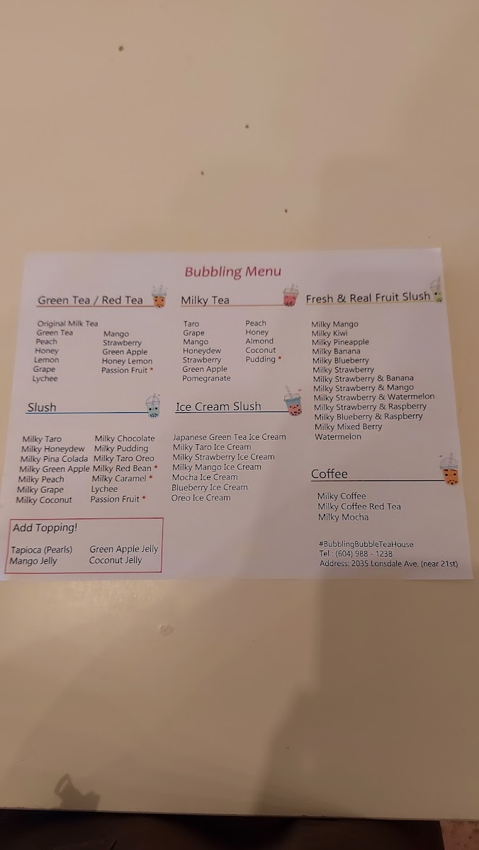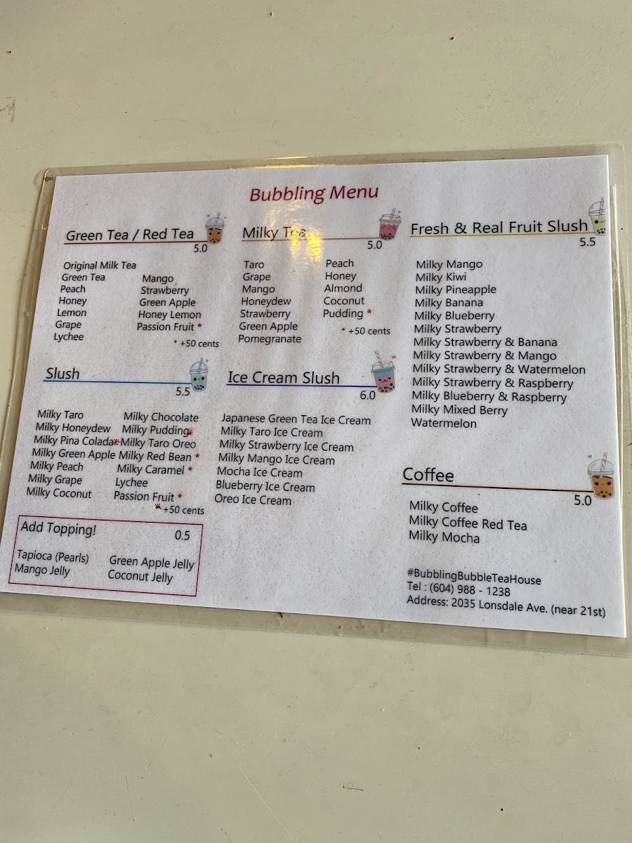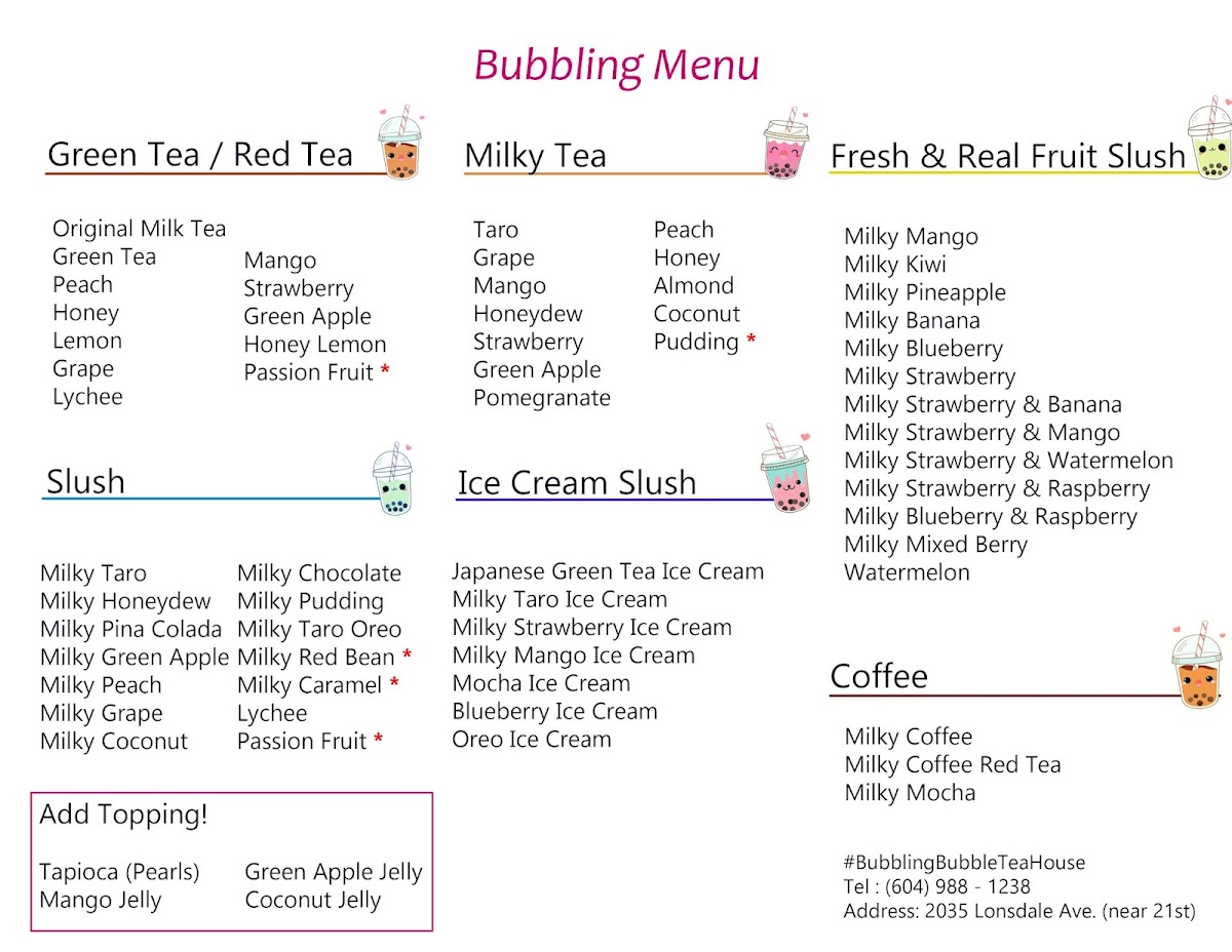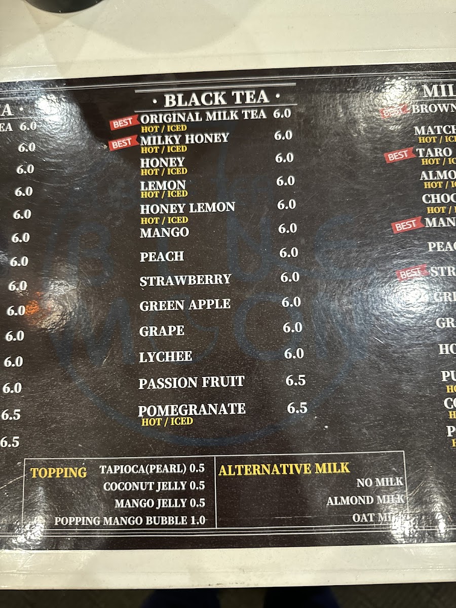 In conclusion, the menu at Bubble Tea Bluemoon offers a diverse and satisfying selection that caters to a wide range of tastes, from refreshing drinks to light bites and desserts. Standout coffee options like Milky Coffee and Milky Mocha Slush provide rich, creamy flavors, while indulgent treats such as Oreo Ice Cream and Matcha Green Tea Ice Cream Slush add a sweet, cooling twist. The fruit slush lineup, including Watermelon and Milky Strawberry + Mango, delivers fresh and vibrant choices, complemented by savory items like the Chicken Sandwich and Bulgogi Croissant Sandwich. Their milk teas, especially Brown Sugar Milk Tea and Mango Milky Tea, are classic crowd-pleasers, while unique slush flavors like Milky Piña Colada and Lychee keep things interesting. Traditional teas such as Lemon Black Tea and Grapefruit Green Tea balance the menu nicely, and desserts like Raspberry Yogurt Cheesecake and the Macaron 6 Pack provide a delightful finish. Overall, the menu reflects a well-rounded mix of comfort, creativity, and refreshing variety.